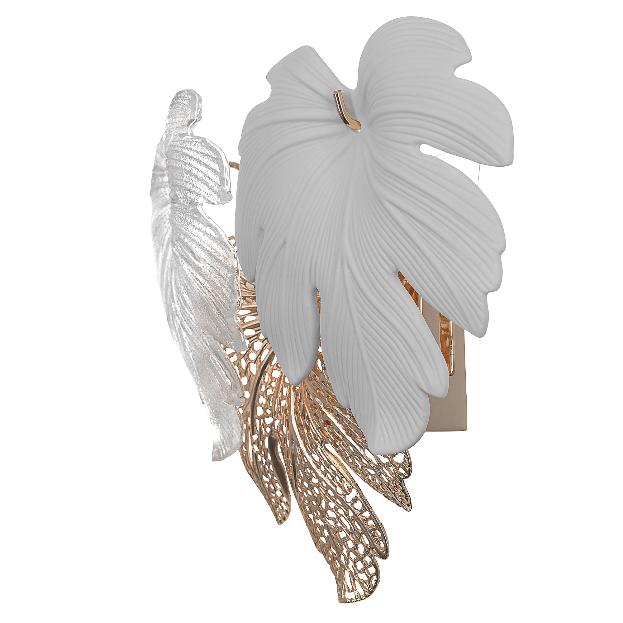 Металлический каркас благородного золотого оттенка дополняют изумительные стеклянные листья, которые формируют утонченный силуэт бра. В светильнике используются 3 лампочки с цоколем E14, максимальная мощность каждой — 60Вт для ламп накаливания.