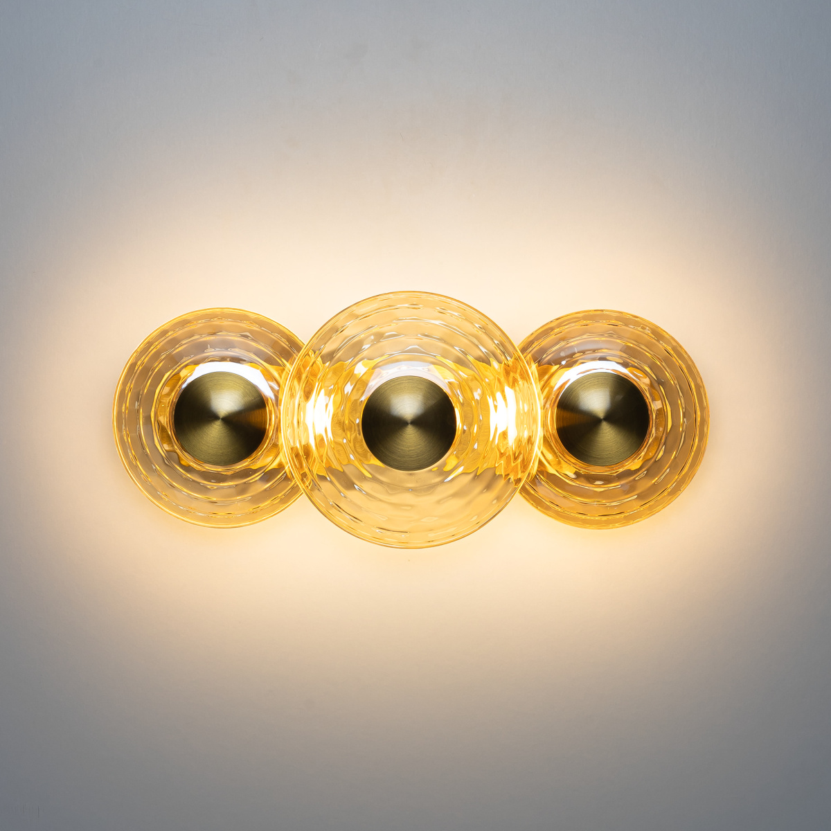 Корпус изготовлен из металла модного оттенка латуни. Круглые плафоны двух диаметров (13 и 15см) из стекла с насыщенной янтарной тонировкой закреплены в ряд на металлическом основании. Мощность изделия составляет 18Вт.