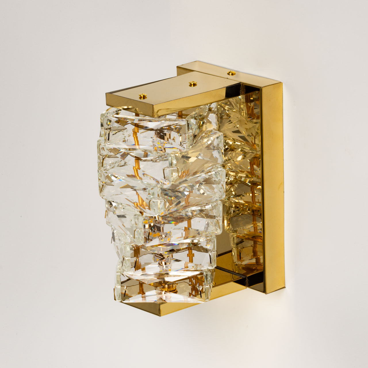 Основание настенного бра выполнено из нержавеющей стали и гальванизировано в цвет золота. Настенный светильник декорирован прозрачным хрусталем прямоугольной формы.