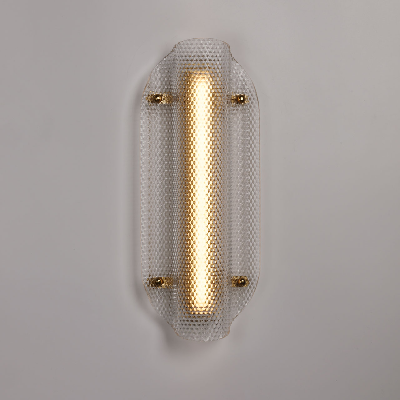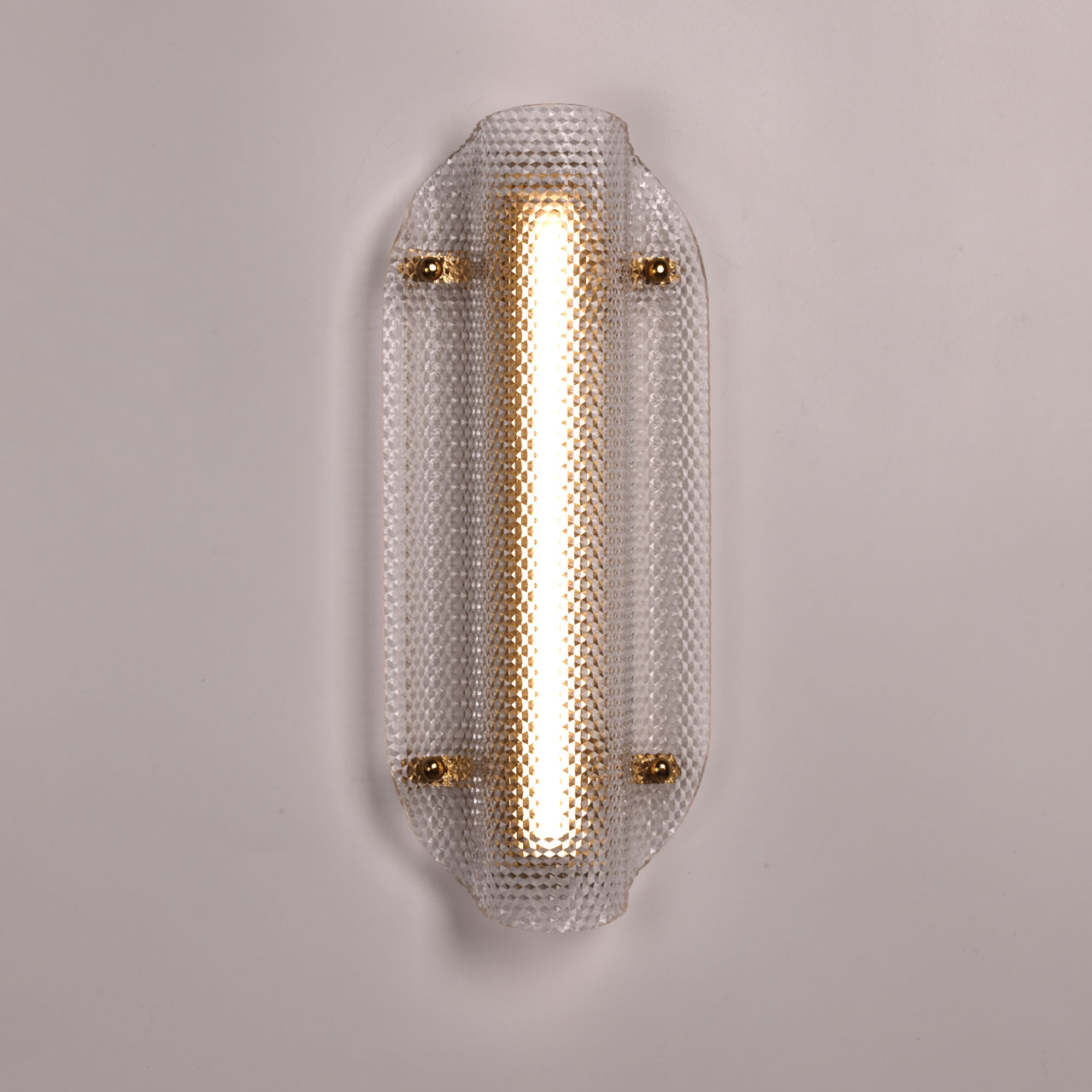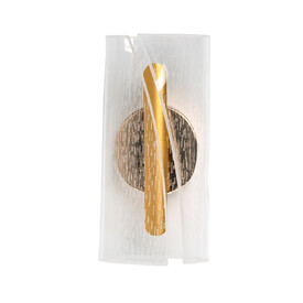 Металлическое основание настенного бра гальванизировано в цвет латуни. Плафон выполнен из прозрачного фактурного литьевого акрила.