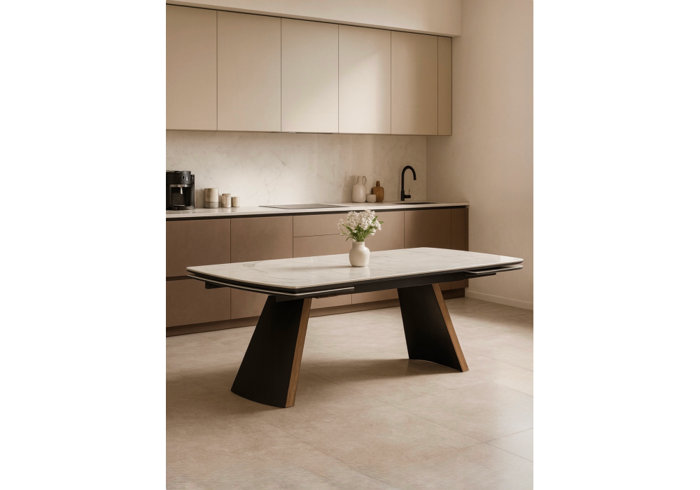 Этот впечатляющий раздвижной стол сочетает в себе роскошную глянцевую керамику и комбинированное основание премиум-класса. Идеальное решение для просторной столовой, где важны безупречная эстетика, долговечность и возможность принимать большие компании.