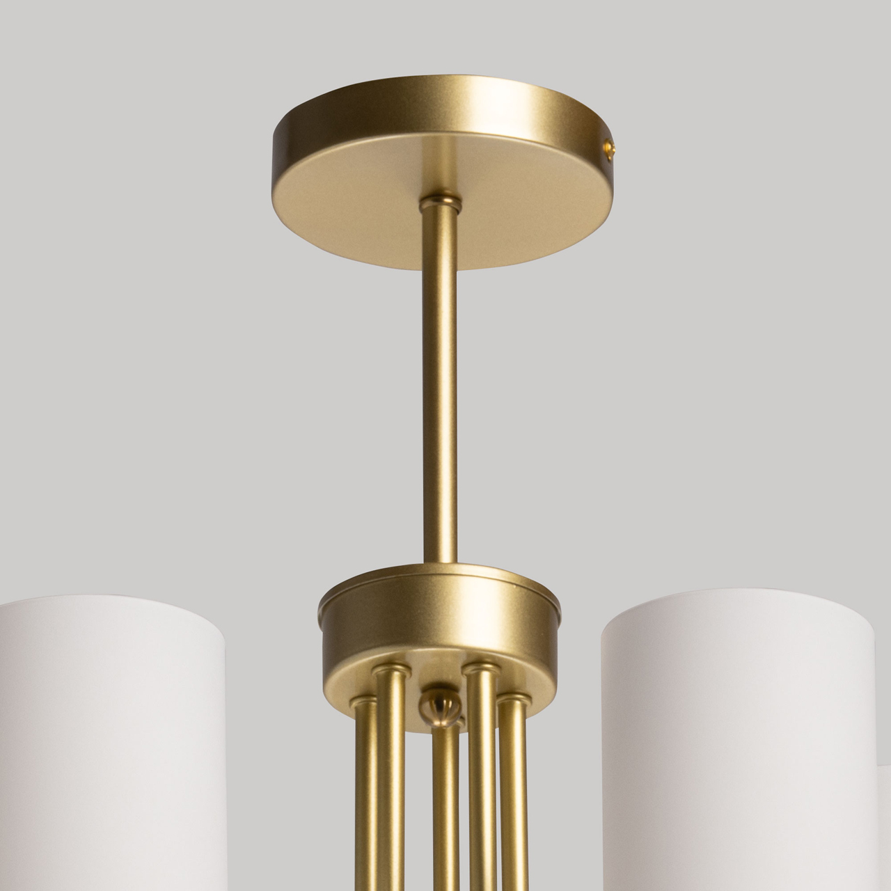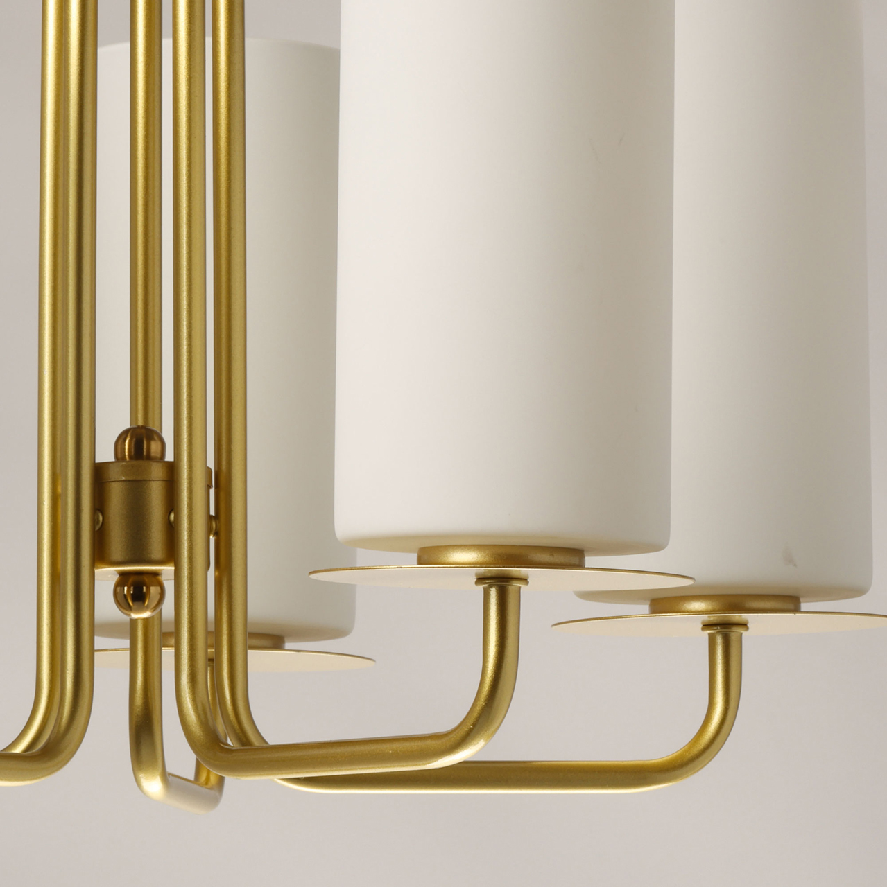 Металлическое основание люстры окрашено в цвет перламутрового золота. Стеклянные плафоны окрашены в белый цвет.