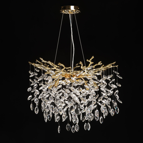 Основание подвесной люстры выполнено по технологии художественного литья из сплава алюминия с цинком и гальванизировано в цвет золота. Люстра декорирована подвесками из прозрачного хрусталя.