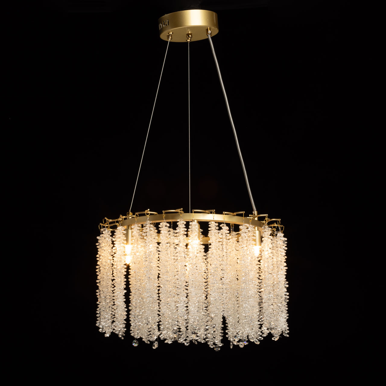 Металлическое основание подвесной люстры гальванизировано в цвет золота. Люстра декорирована прозрачным хрусталем.
