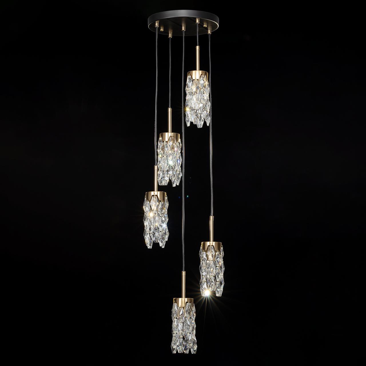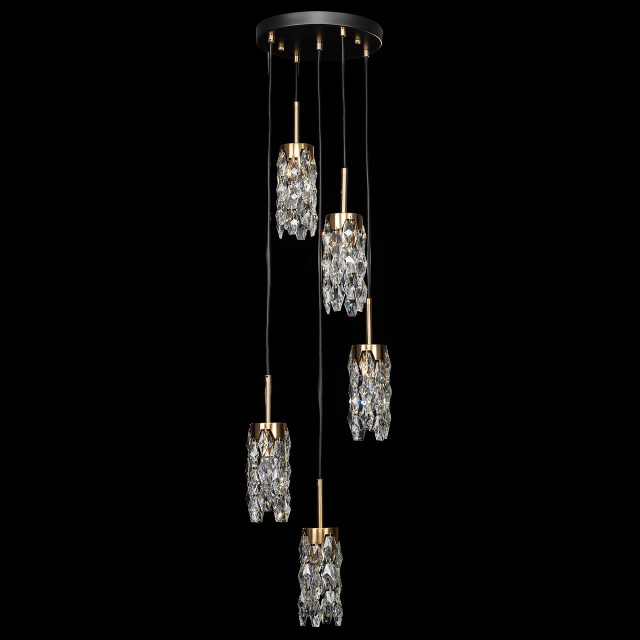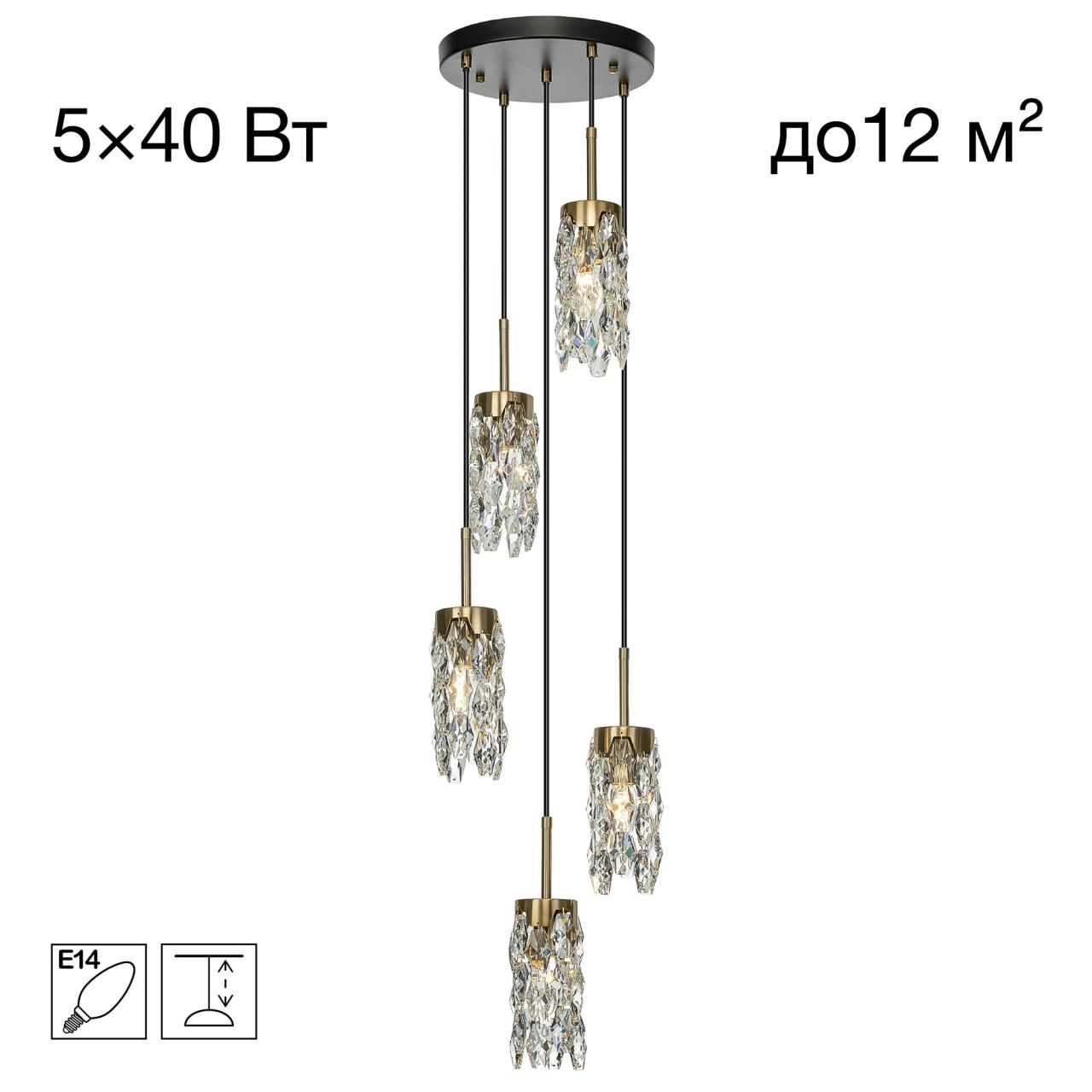Каркас светильника — металлический, основание круглое, черного оттенка, на нем закреплено пять подвесов. Бронзовые плафоны — цилиндрической формы, с хрустальными подвесками. Высоту подвесов можно отрегулировать, подстраиваясь под высоту потолков в помещении. Для изделия используются пять лампочек с цоколем Е14, максимальная мощность для ламп накаливания — 40Вт.