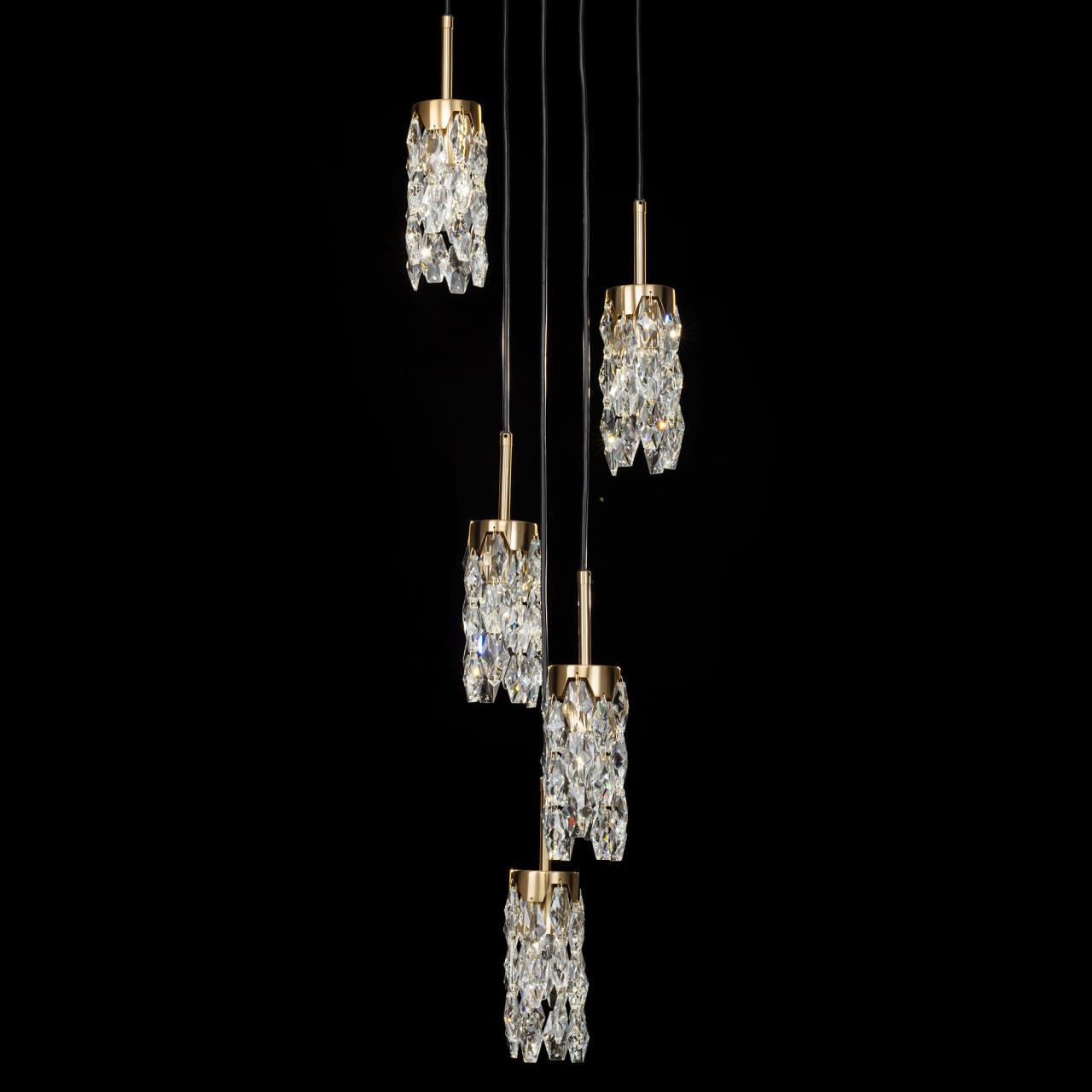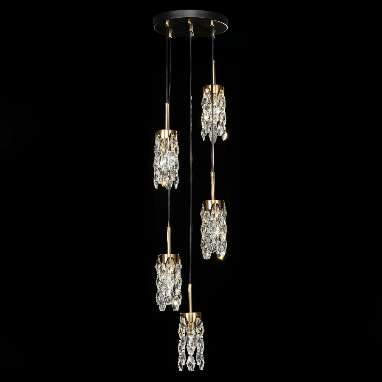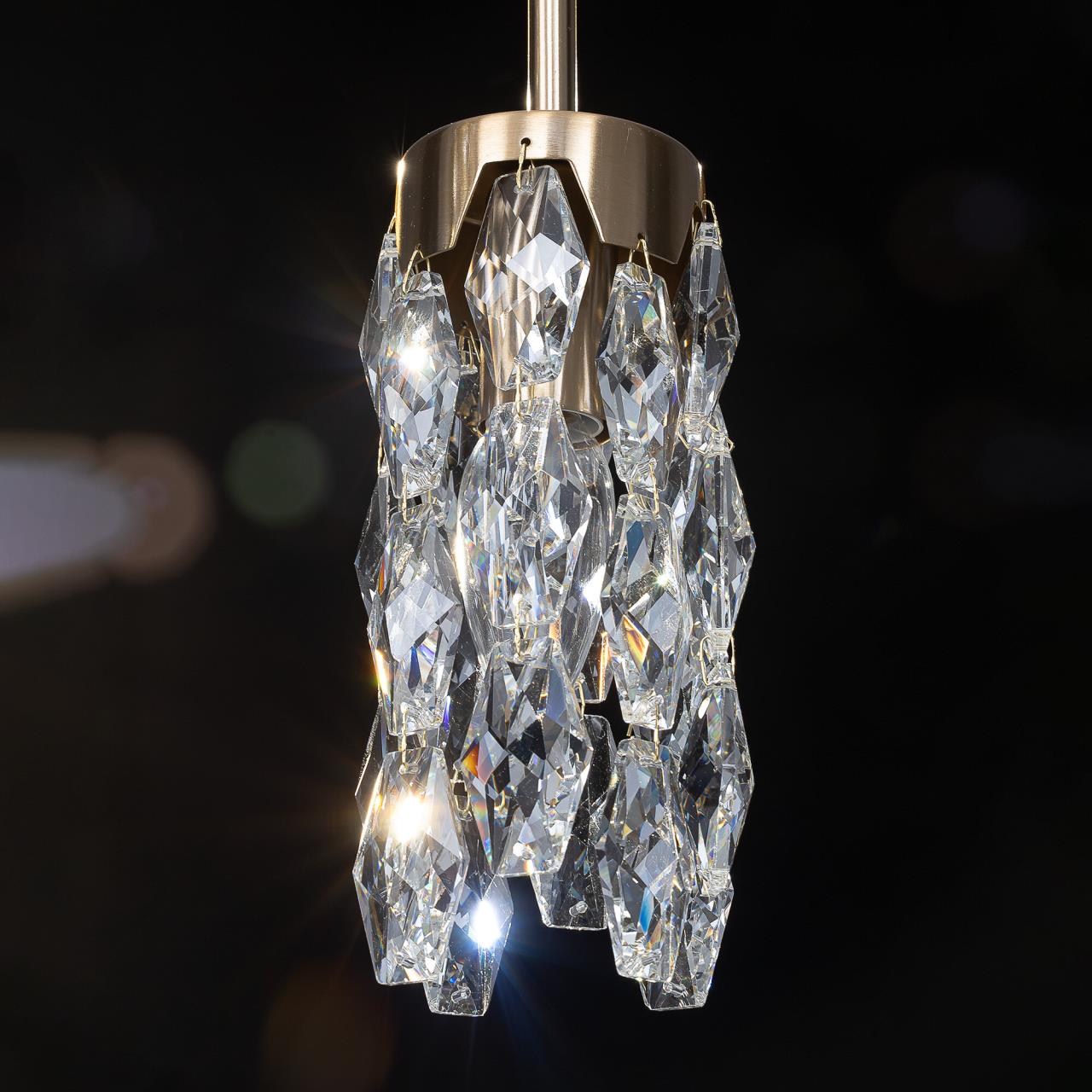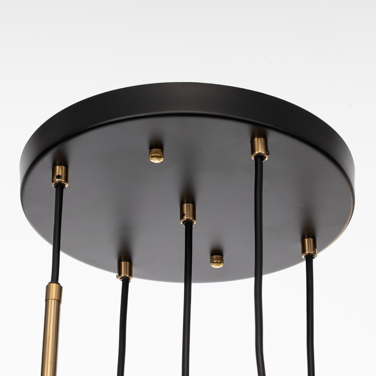 Каркас светильника — металлический, основание круглое, черного оттенка, на нем закреплено пять подвесов. Бронзовые плафоны — цилиндрической формы, с хрустальными подвесками. Высоту подвесов можно отрегулировать, подстраиваясь под высоту потолков в помещении. Для изделия используются пять лампочек с цоколем Е14, максимальная мощность для ламп накаливания — 40Вт.