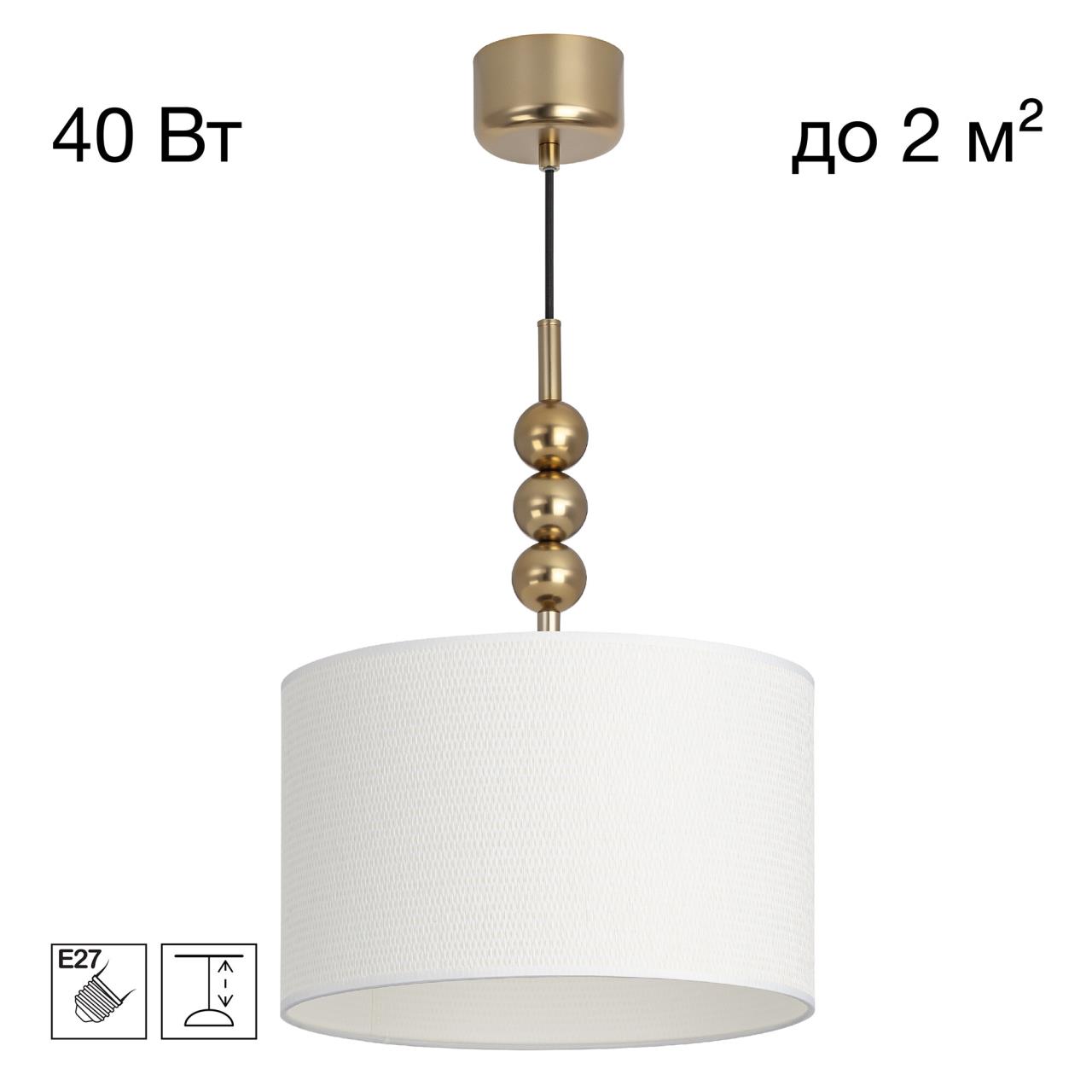 Металлический золотистый каркас светильника дополняют декоративные элементы — несколько шариков на стойке. Цилиндрический абажур из белого матового текстиля создает мягкое заливное освещение, которое придаст уюта вашей гостиной, спальне или коридору.