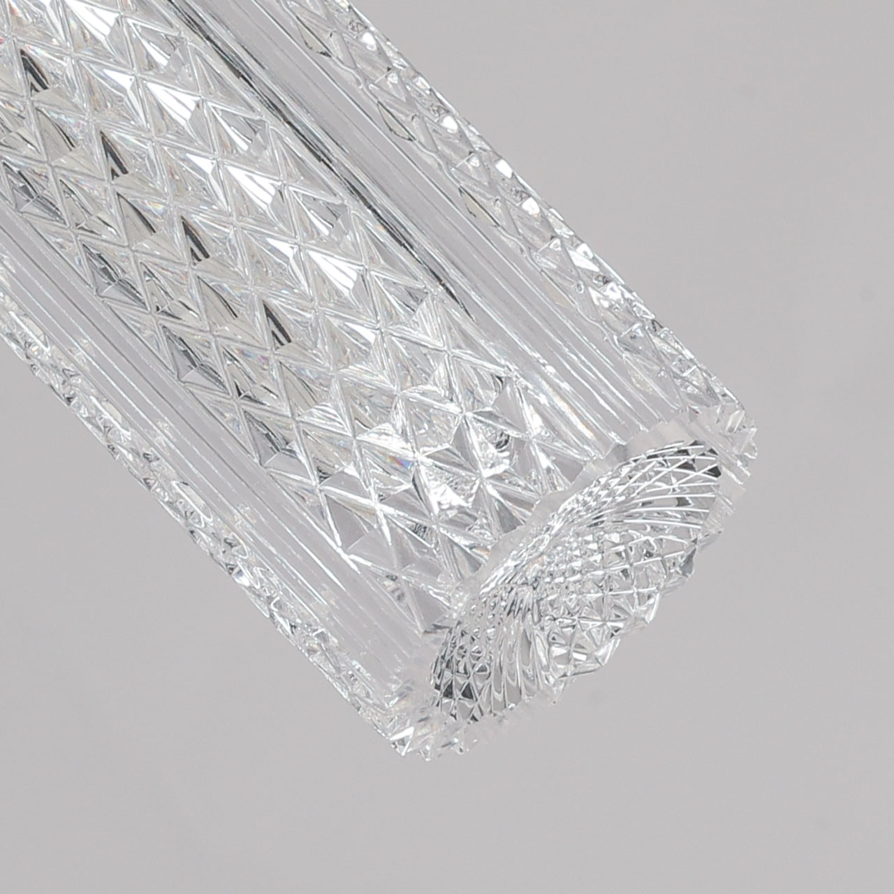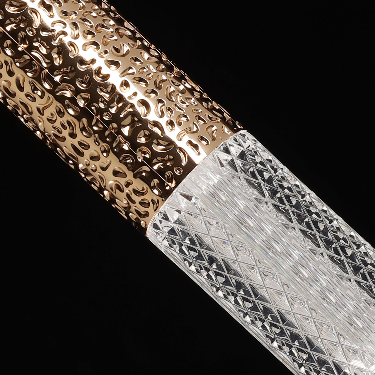 Металлическая потолочная чаша подвеса гальванизирована в цвет французского золота. Корпус плафона в виде цилиндра выполнен из сплава алюминия с цинком и гальванизирован в цвет основания. Светодиодный источник света закрыт прозрачным фактурным акрилом.