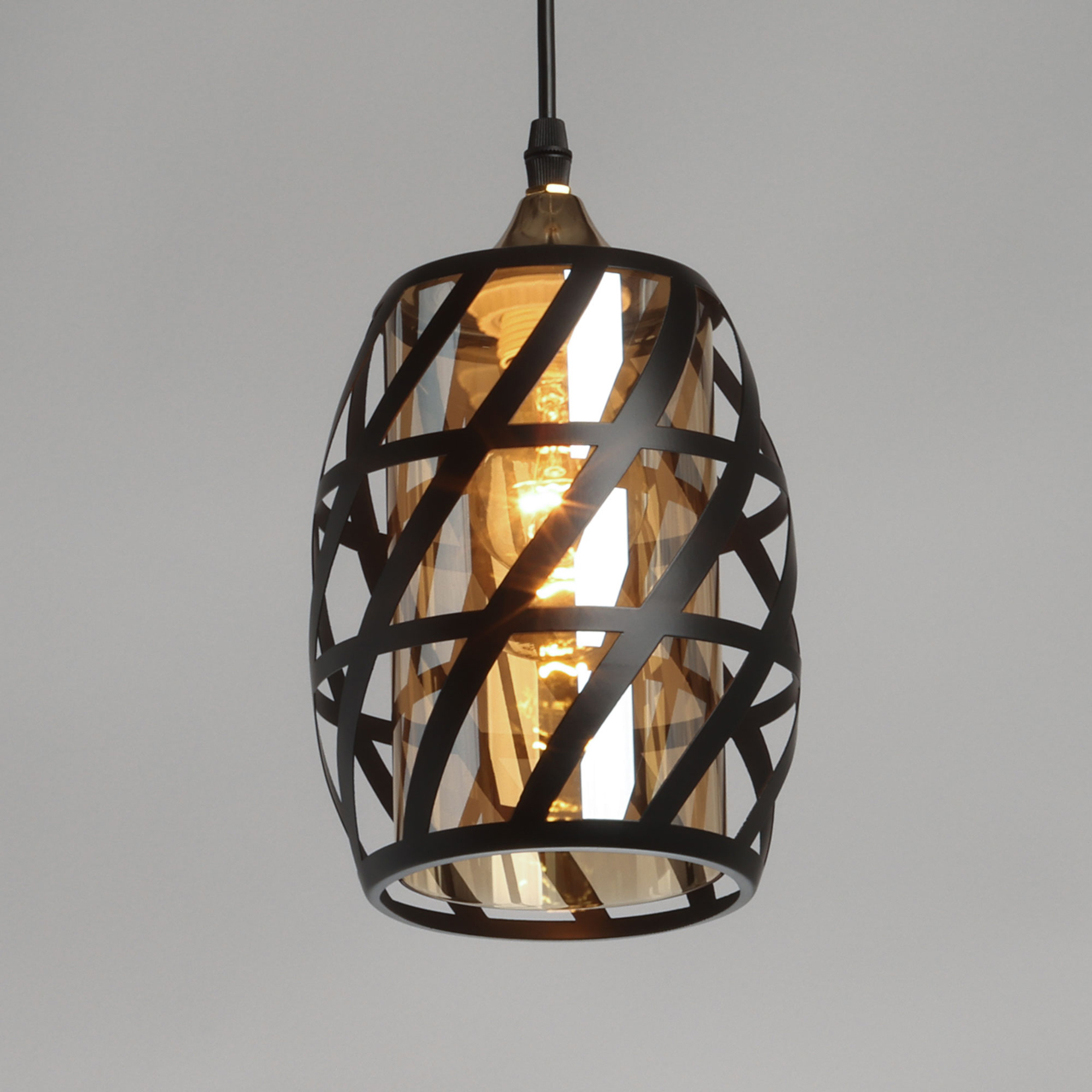 Потолочная чаша и держатель плафона выполнены из металла и гальванизированы в цвет золота. Металлический плфон окрашен в черный цвет. Внутренний стеклянный плафон гальванизирован в цвет шампань.