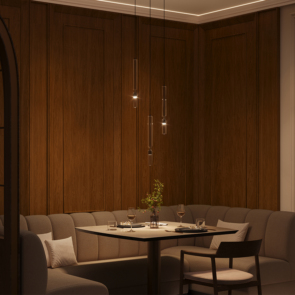Серия миниатюрных подвесных светильников включает модели с алюминиевой арматурой черного цвета и цвета сатинированной латуни. Плафоны выполнены из стекла в форме колбочки. Встроенный LED-источник света с цветовой температурой 3000K. Угол рассеивания 120 градусов, индекс цветопередачи CRI 80. Высота плафонов 400 мм, диаметр 40 мм, высота подвеса регулируется до 3435 мм. Предназначены для акцентного освещения и зонирования пространства. Подходят для использования в спальнях, детских, гостиных и столовых зонах. Могут использоваться как одиночно, так и в групповых композициях.