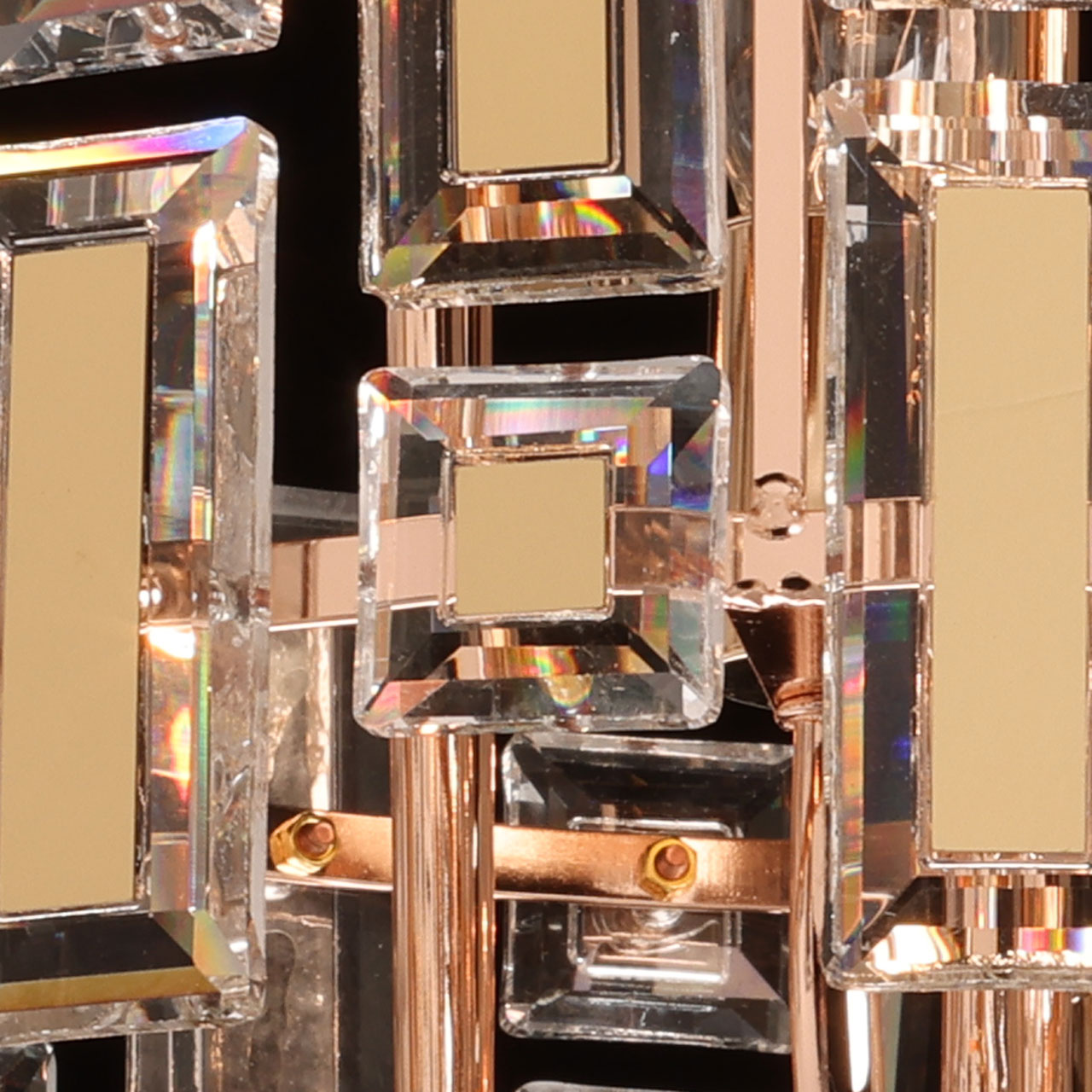 Металлическое основание потолочной люстры гальванизировано в цвет золота. Люстра декорирована прозрачным хрусталем прямоугольной формы. Хрустальные элементы разного размера дополнительно декорированы металлическими пластинами, гальванизированными в цвет основания.