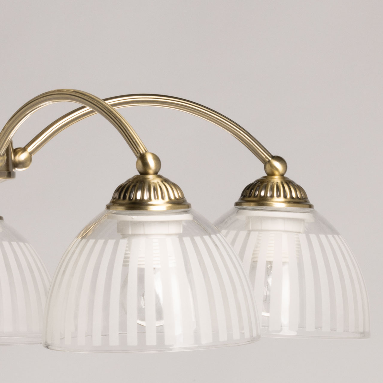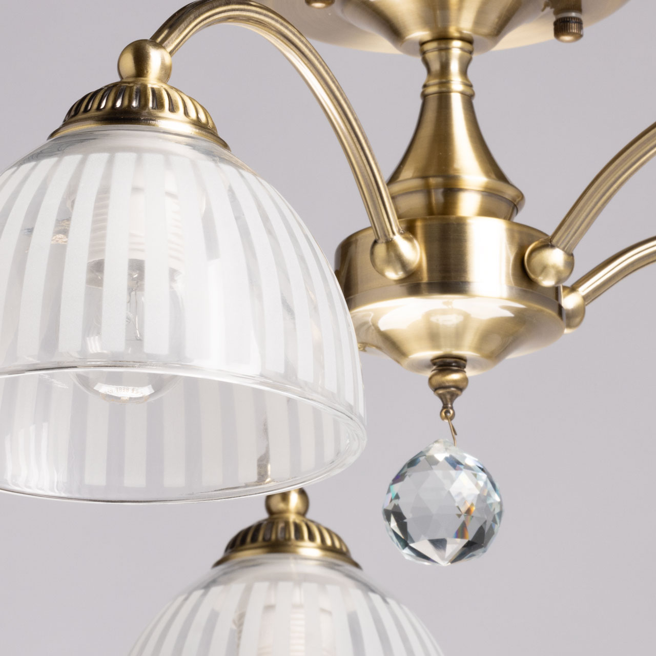 Металлическое основание потолочной люстры гальванизировано в цвет античной бронзы. Люстра декорирована плафонами из прозрачного стекла, матированного по трафарету.