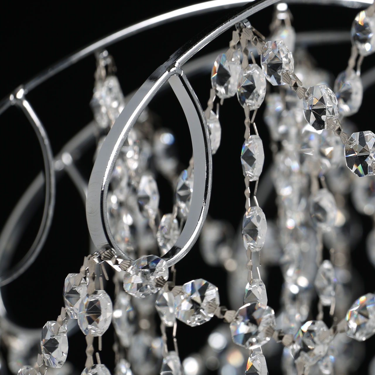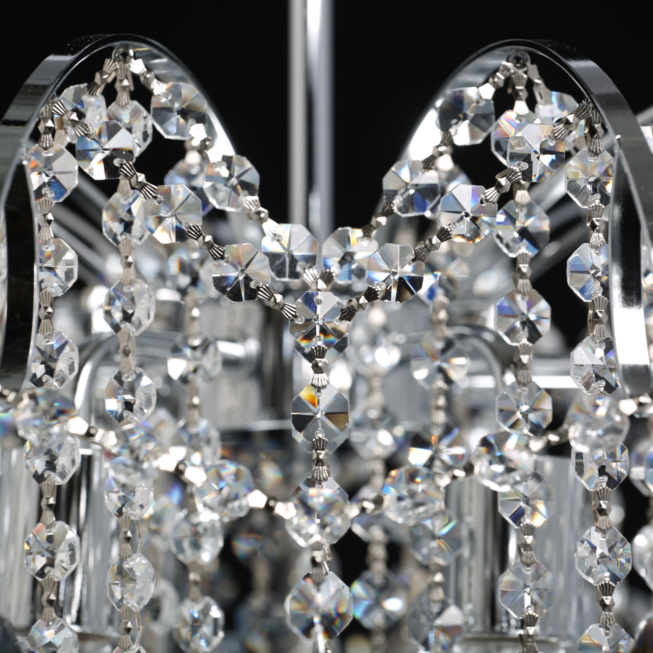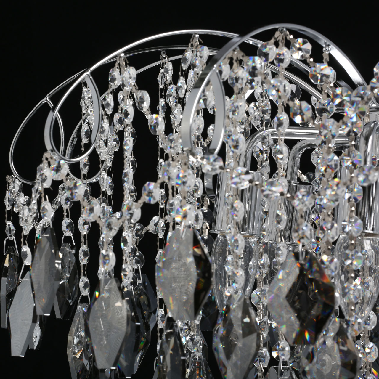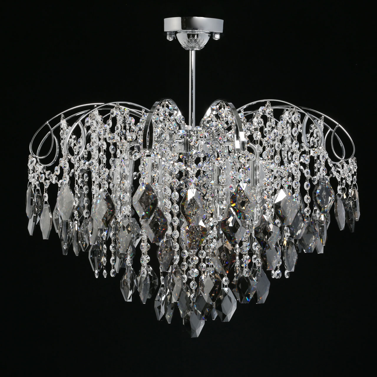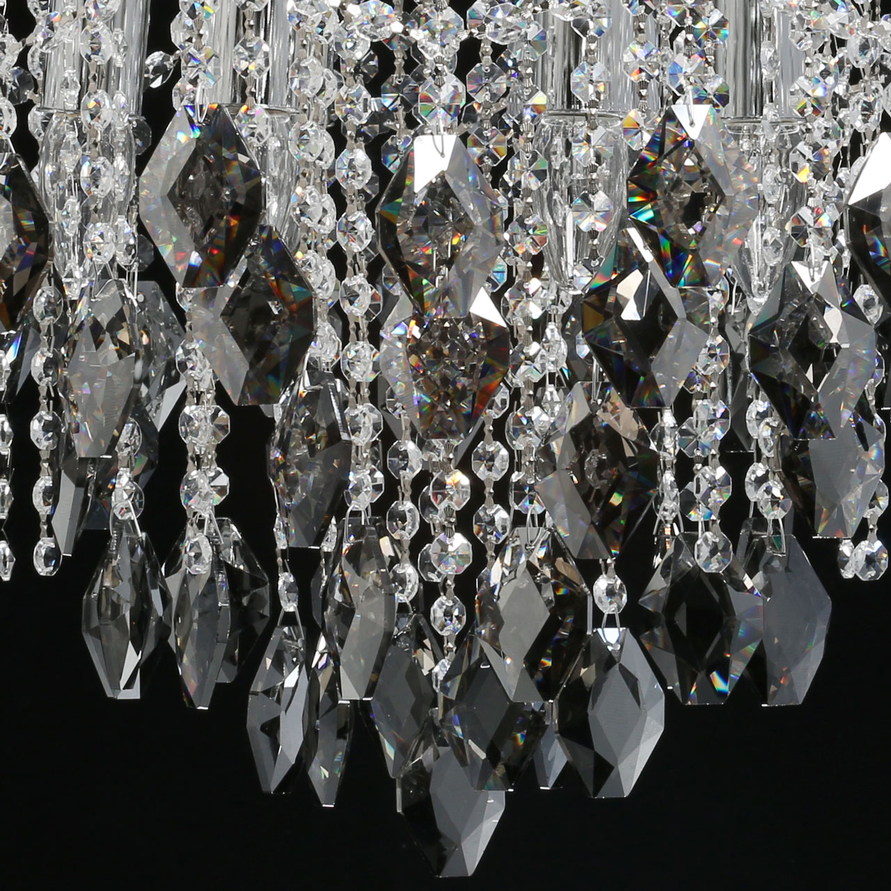 Металлическое основание гальванизировано в цвет хрома. Светильник декорирован хрусталем формы ромбов, гальванизированным в дымчатый цвет и прозрачным хрусталем в форме октагонов.