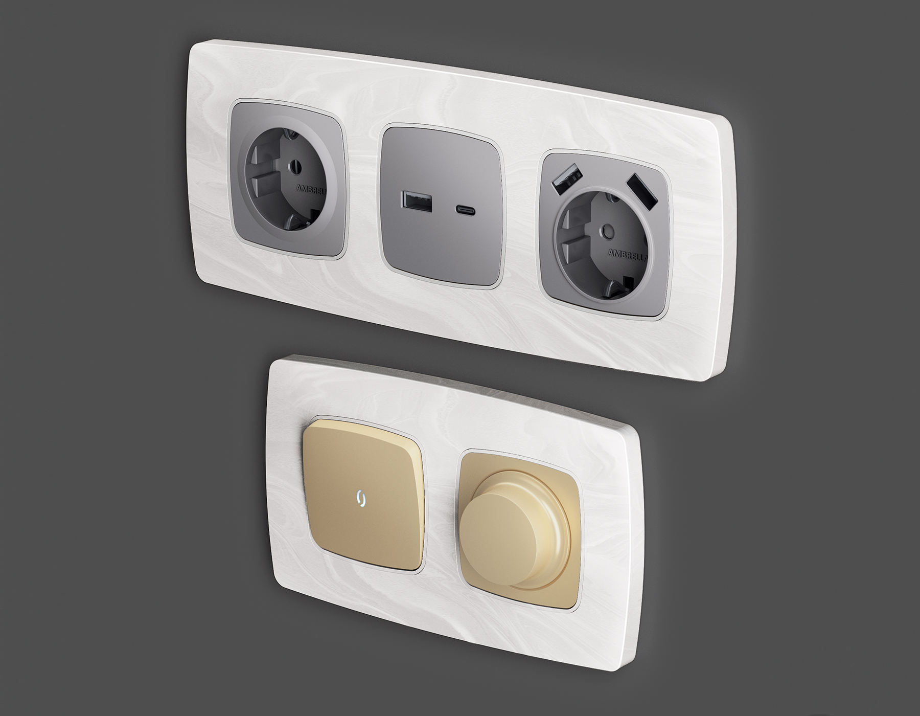 Многогранный ассортимент Ambrella Volt включает в себя механизмы, лицевые панели и рамки, а также комплекты, доступные в различных цветовых решениях. Продукция представлена в модульном исполнении, что позволяет гибко настраивать внешнийвид и функциональность. Вам будет легко заменить лицевую панель, рамку или механизм, найдя идеальное сочетание цветов.