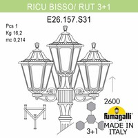 Садово-парковый фонарь FUMAGALLI серии RUT, модель RUT /RICU/BISSO 3+1. Парковый торшер, столб RICU с тремя уличными фонарями RUT на трех малых консолях BISSO и одним светильником на опоре. По форме напоминае "трезубец". Используются для архитектурного и ландшафтного освещения в стиле "классика". Место установки столбиков освещения - парковые дорожки, cкверы, садовые участки, тротуары, а так же ландшафтные и архитектурные объекты. Могут устанавливаться и внутри помещений в качестве декоративных уличных фонарей. Изготовлены в Италии, по уникальным технологиям "FUMAGALLI" из современного композитного полимера RESIN. Этот материал в 5 раз прочнее металла, не ржавеет, не окисляется, не выгорает на солнце, его не нужно красить. Все светильники пыле-влаго защищены по стандарту IP55 (Пылезащищенные, защита от водяных струй с любого направления). Рассеиватель выполнен из антивандального, не мутнеющего и не горючего PMMA (ПолиМетилМетаАкрилат). Срок службы светильника - не менее 20 лет. Температура использования от -60 до +90. В серии RUT есть фонари в настенном (BISSO/ RUT, OFIR/ RUT, MIRRA/ RUT, PORPORA/ RUT) подвесном (SICHEM/ RUT) и наземном исполнении (MINILOT/ RUT, MIZAR.R/ RUT, IAFAET.R/ RUT, ALOE.R/ RUT, ARTU/ RUT, GIGI/ RUT, RICU/ RUT, RICU/ISSO/ RUT 2L, NEBO/ RUT, NEBO OFIR/ RUT 2L, NEBO OFIR/ RUT 3L) со столбами разной высоты, с разным количеством и конфигурацией голов. Консоли настенных фонарей и кронштейны светильников на столбах освщения могут устанавливаться вверх/вниз. Столбы выше 150 см имеют в основе мощную стальную трубу с двойной оцинковкой. При заказе требуется выбрать цвет корпуса, цвет плафона и тип патрона. По стилю и дизайну серия уличных светильников RUT похожа на светильники малого размера серии ANNA и на светильники большого размера серии NOEMI. По размеру RUT относится к средним светильникам как серия CEFA, SALEM и GLOBE 300.