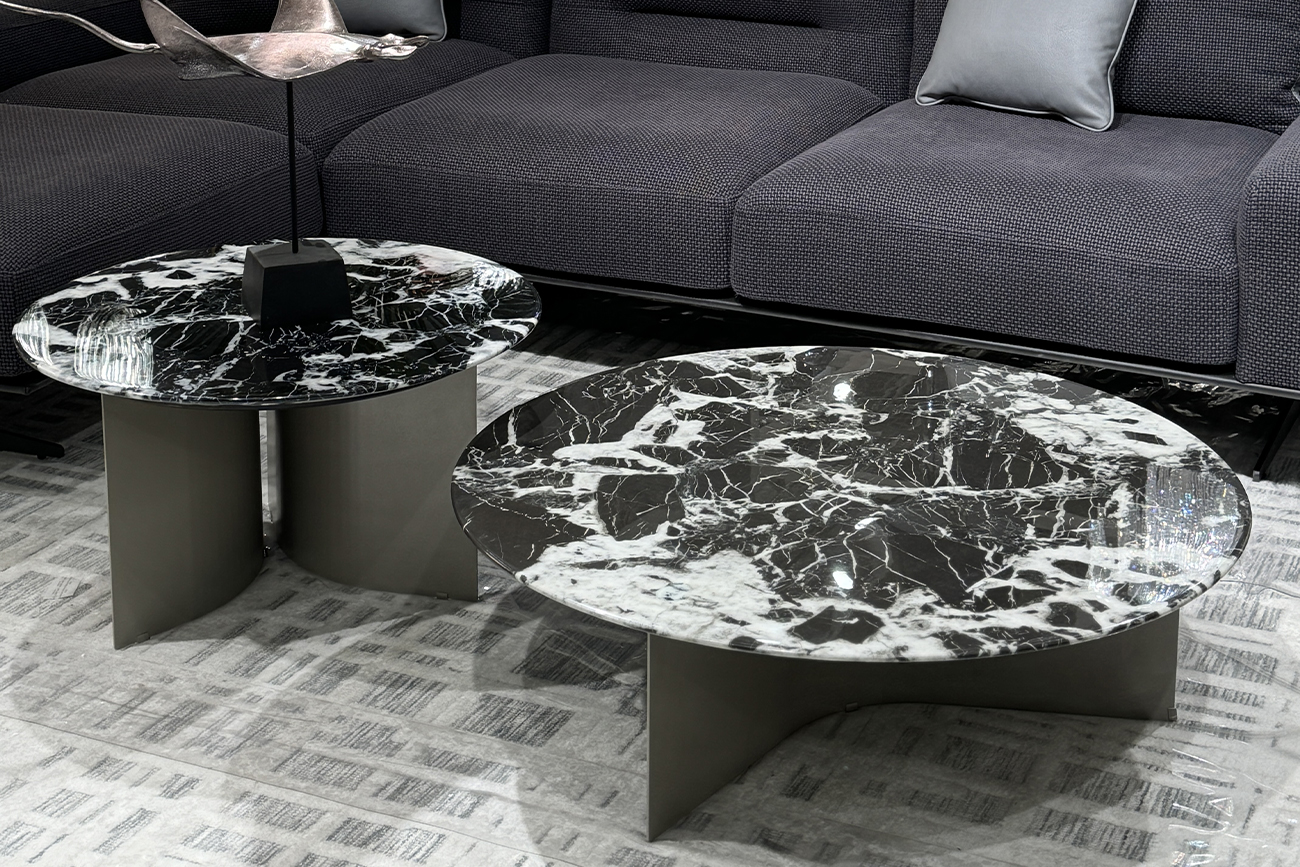 Роскошный журнальный стол с круглой столешницей из натурального мрамора с полимерным покрытием станет доминантой просторной гостиной или холла в стиле ар-деко. Столешница выполнена из натурального камня черного цвета с белыми прожилками. Уникальный природный рисунок мрамора, неповторимый в каждом изделии, делает этот журнальный стол похожим на произведение искусства. Опоры стола, выполненные из нержавеющей стали цвета бежевый металлик, выглядят легко и изящно. Эта модель стола исполнена из искусственного черно-белого мрамора (камень с полимерным покрытием). Основание из гнутых листов нерж.стали цвета бежевый металлик.
