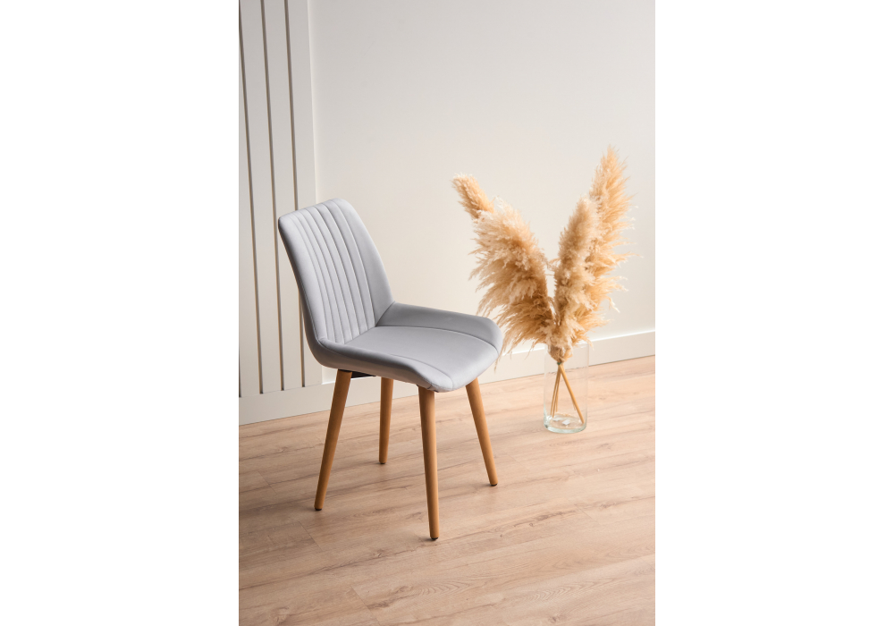 Материал каркаса - дерево; Материал сиденья - велюр; Материал обивки - велюр; Цвет ножек - натуральный; Ширина - 50; Глубина - 56; Высота - 82; Ширина сиденья - 47; Глубина сиденья - 42; Высота сиденья - 48;