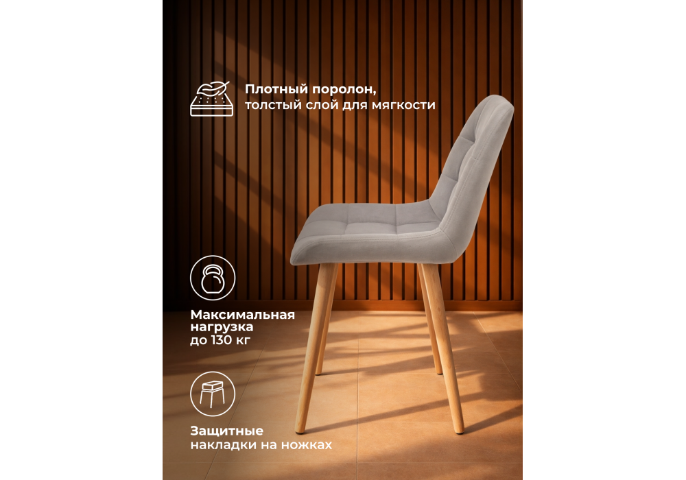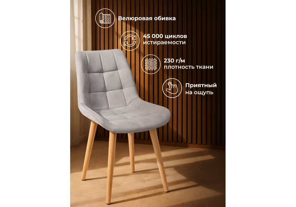 Материал каркаса - дерево; Материал сиденья - велюр; Материал обивки - велюр; Цвет ножек - натуральный; Ширина - 50; Глубина - 60; Высота - 80; Ширина сиденья - 44; Глубина сиденья - 41; Высота сиденья - 48;