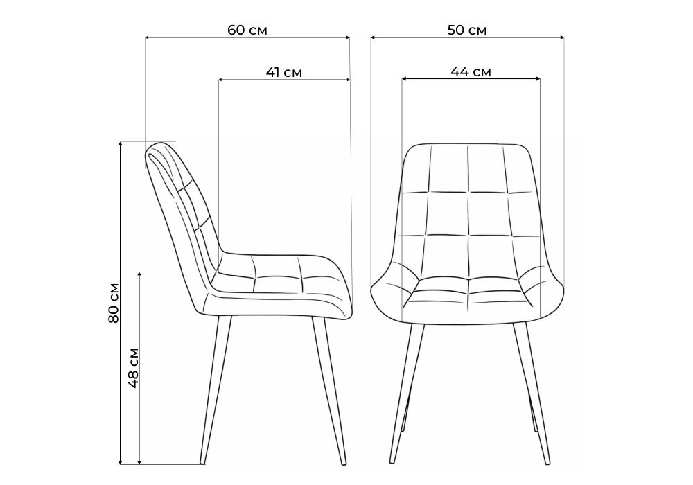 Материал каркаса - металл; Материал сиденья - велюр; Материал обивки - велюр; Цвет ножек - серый; Ширина - 50; Глубина - 60; Высота - 80; Ширина сиденья - 44; Глубина сиденья - 41; Высота сиденья - 48;