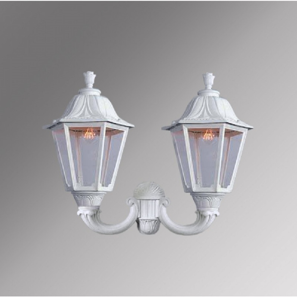 Светильник уличный настенный FUMAGALLI большого размера серии NOEMI, модель MIRRA/NOEMI. Двойной настенный уличный фонарь, большого размера с креплением на стену с помощью 2 консолей OFIR среднего размера. Устанавливается на стены домов, котеджей, заборов и других вертикальных поверхностей. Используется для освещения входных групп, общего уличного освещения, декоративной и фасадной подсветки. Изготовлены в Италии, по уникальным технологиям "FUMATECH" из современного композитного полимера RESIN. Этот материал в 5 раз прочнее металла, не ржавеет, не окисляется, не выгорает на солнце, его не нужно красить. Все светильники пыле-влаго защищены по стандарту IP55 (Пылезащищенные, защита от водяных струй с любого направления). Рассеиватель выполнен из антивандального, не мутнеющего и не горючего PMMA (ПолиМетилМетаАкрилат). Срок службы светильника - не менее 20 лет. Температура использования от -60 до +90. В серии NOEMI есть садовые фонари в настенном (OFIR/NOEMI, MIRRA/NOEMI) подвесном (SICHEM/NOEMI) и наземном исполнении (IAFAET.R/NOEMI, ALOE.R/NOEMI, ARTU/NOEMI, GIGI/NOEMI, RICU/NOEMI, NEBO/OFIR/NOEMI 1L, NEBO/OFIR/NOEMI 2L, TABOR/ADAM/NOEMI 3L) со столбами разной высоты, с разным количеством и конфигурацией голов. Консоли настенных фонарей и кронштейны светильников на столбах освещения могут устанавливаться в положение вверх и вниз. Столбы выше 150 см имеют в основе мощную стальную трубу с двойной оцинковкой. При заказе требуется выбрать цвет корпуса, цвет плафона и тип патрона (Е-27 или LED GX-53). Возможен светодиодный вариант. По стилю и дизайну серия уличных светильников NOEMI похожа на светильники среднего размера серии RUT и на светильники малого размера серии ANNA. По размеру относится к большим парковым светильникам как серия SIMON и GLOBE 400.