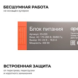 Блок питания Apeyron 24В, 400Вт, 170-265В, 16,6А, IP20, алюм., 239х63х30, PRO, серый 03-220