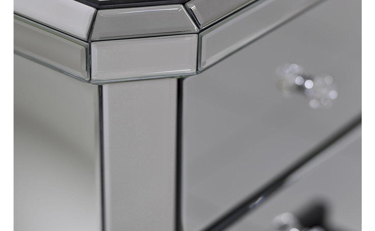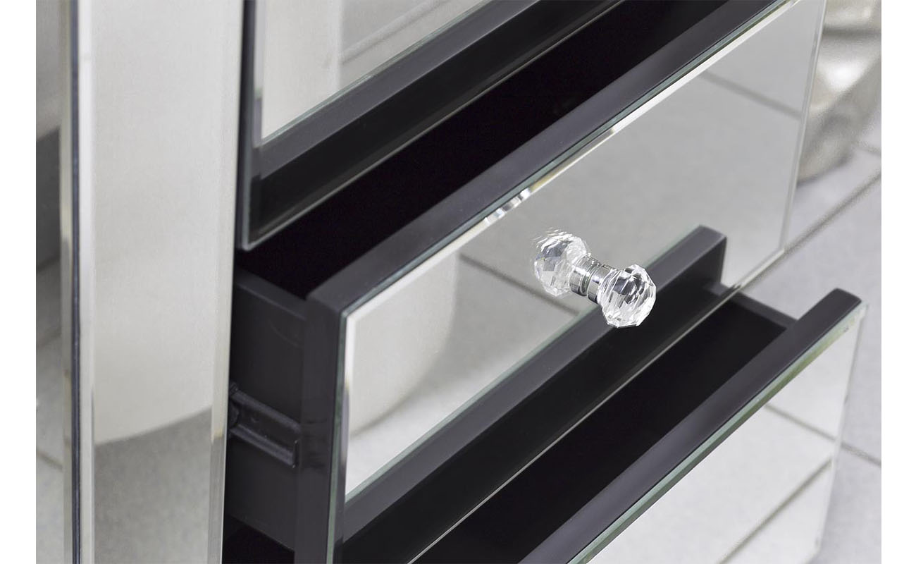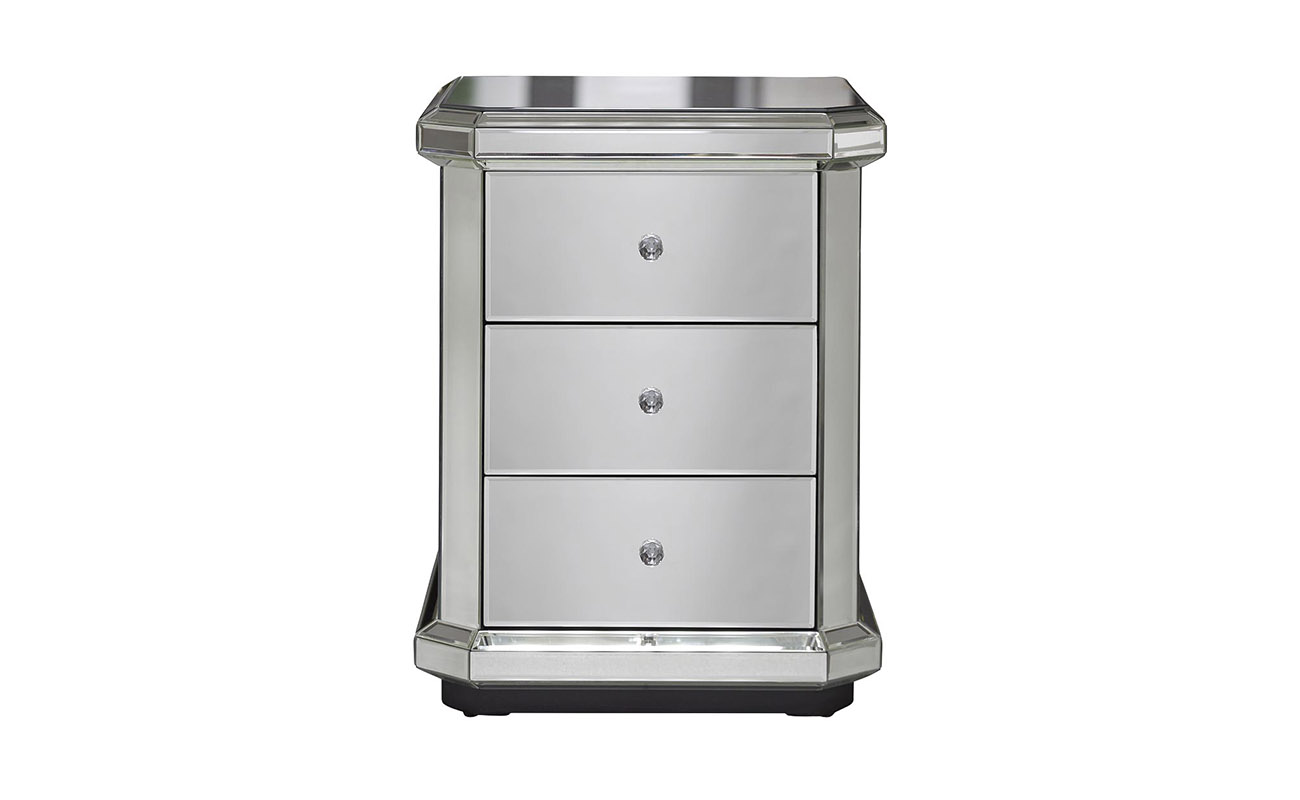 Сдержанная по форме, но эффектная в исполнении зеркальная тумбочка — выбор покупателей с воображением и художественным вкусом. Отражающая поверхность взаимодействует с окружающими предметами, создавая необычный акцент в интерьере. Три вместительных ящика предназначены для хранения самых разных вещей: от косметики до белья. На фото зеркальная тумбочка смотрится просто изумительно, но в реальности она выглядит еще роскошнее. Красивые хрустальные ручки добавляют изысканности и шарма. Тумба прекрасно сочетается практически со всеми видами мебели и декора, а также различными вариантами текстиля.