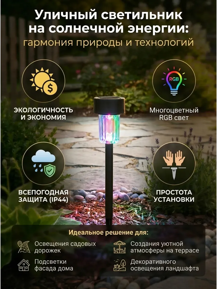 Позвольте этому изящному светильнику превратить ваш участок в оазис комфорта и уюта, где каждый вечер будет наполнен мягким, обволакивающим светом. Наслаждайтесь природной энергией и современным дизайном без лишних затрат!
