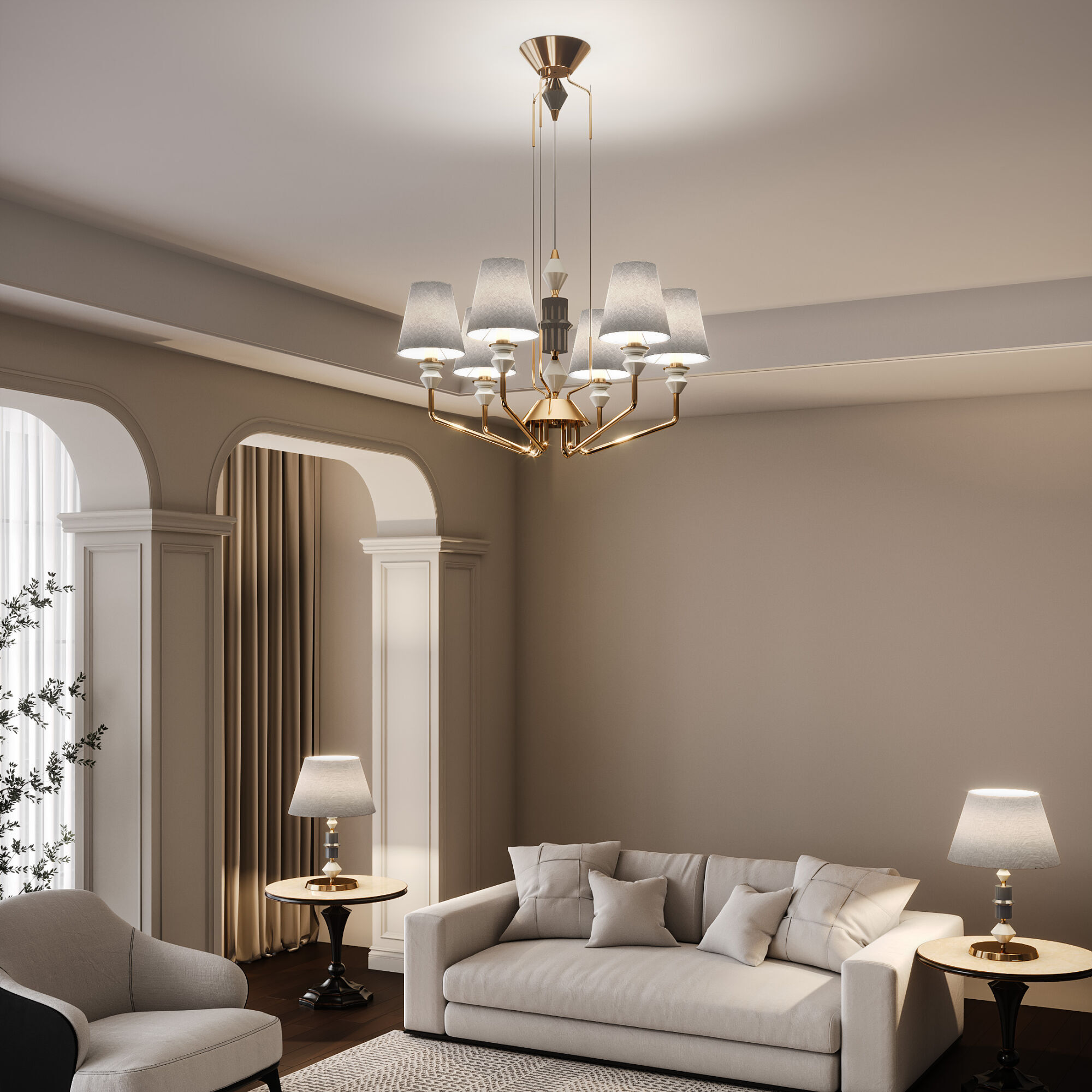 Люстра прекрасно впишется в интерьер гостиной, столовой или спальни, выполненный в классическом, современном или эклектичном стиле.