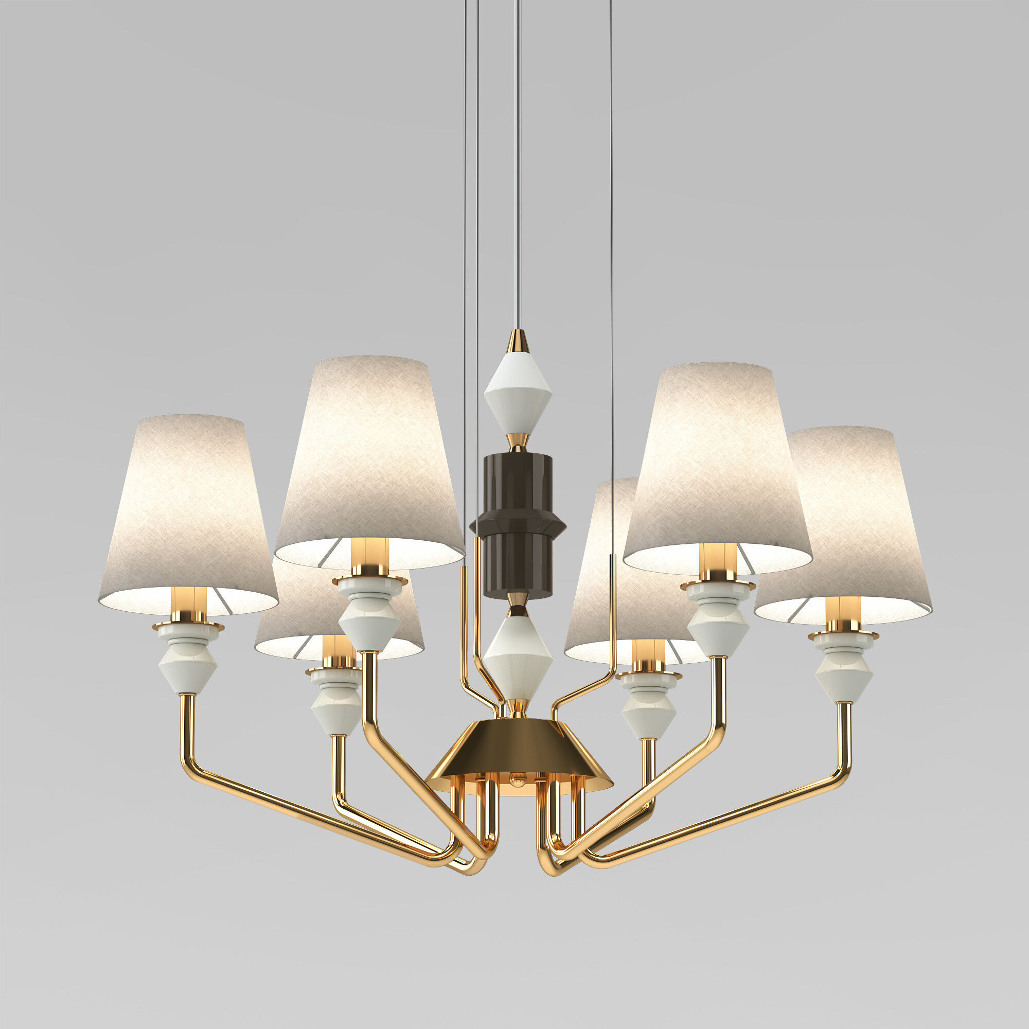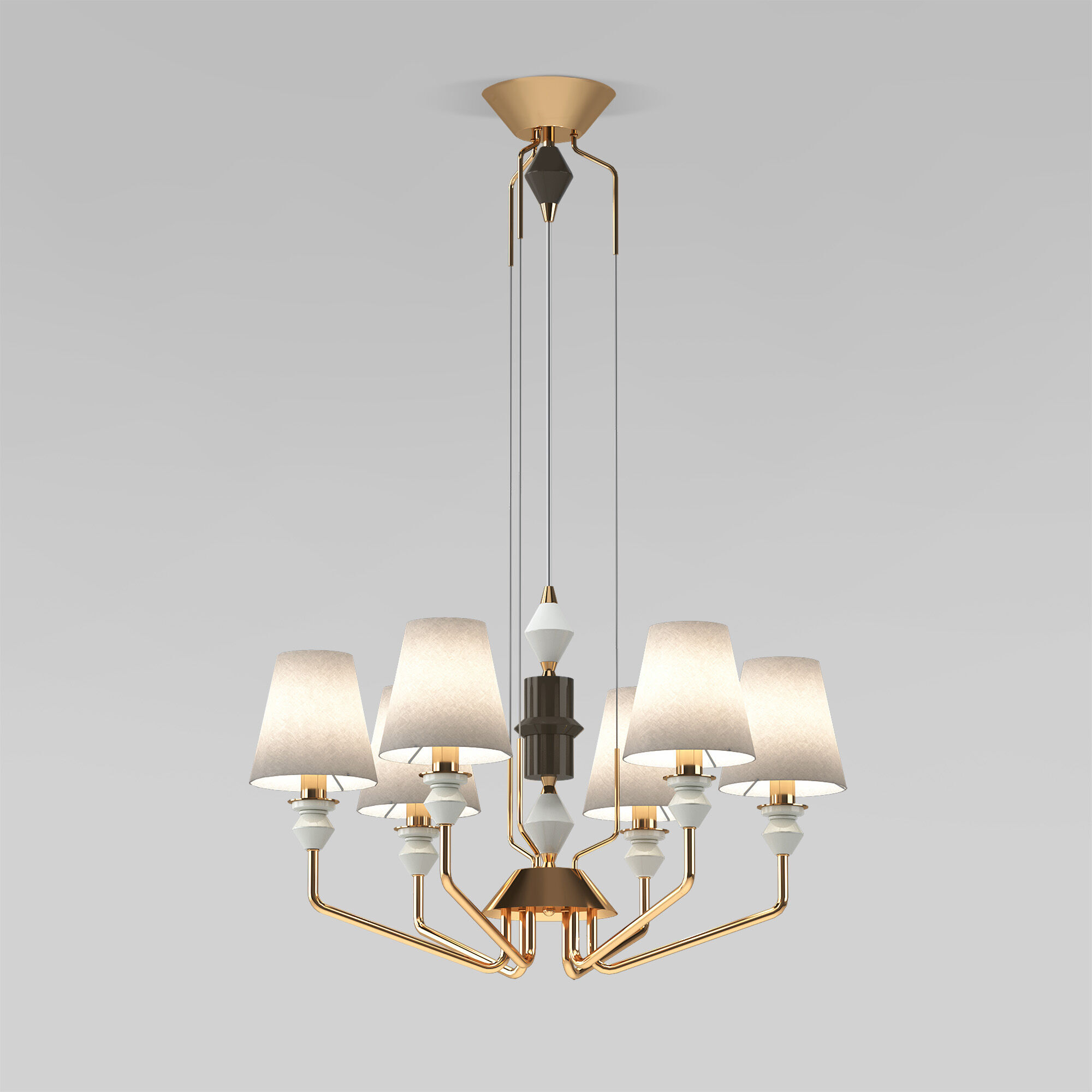 Каркас люстры с его плавными линиями добавляет роскоши и изысканности, а абажуры из ткани создают мягкое освещение. Декоративные элементы в центре люстры, выполненные из керамики в контрастных цветах, придают ей оригинальность и подчеркивают внимание к деталям.